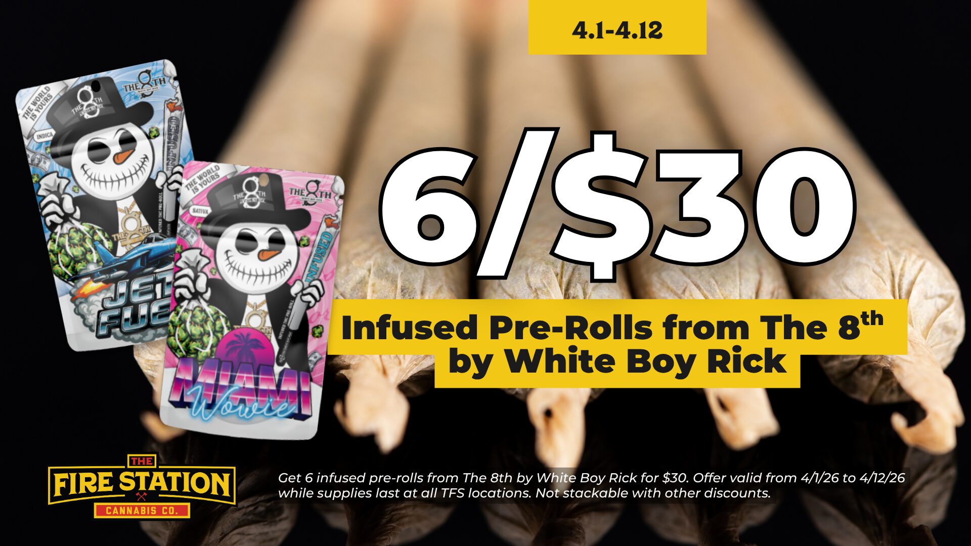 Get 6 infused pre-rolls from The 8th by White Boy Rick for $30. Offer valid from 4/1/26 to 4/12/26 while supplies last at all TFS locations. Not stackable with other discounts.